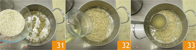 Mientras tanto, añade el arroz a la cebolla bien pochada 31. Mezcla rápidamente y deja dorar durante unos 2 minutos. Desglasa con el vino blanco 32 y mezcla con cuidado de no romper el arroz. Humedece el arroz con un tercio del caldo caliente 33, luego cocina añadiendo más caldo según sea necesario.