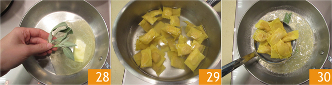 Están listos para la cocción: pongan a hervir una olla con agua salada mientras en una sartén derriten la mantequilla con algunas hojas de salvia 28. Cocinen los tortelli en el agua hirviendo durante 1-2 minutos 29, luego escúrranlos directamente en la sartén con la mantequilla derretida 30.