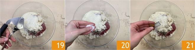 Tritura el ajo dentro 19, añade sal 20 y nuez moscada 21.