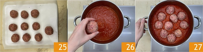 Obtendrás una decena de albóndigas 25. Pasada la media hora, sumerge las albóndigas en la salsa 26, de modo que no se superpongan 27.
