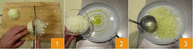 Para preparar las albóndigas danesas (Frikadeller) con patatas con perejil, pon al fuego una olla con agua salada que utilizarás para el Caldo de verduras. Pica finamente la cebolla 1 y déjala pochar en una sartén antiadherente junto con el aceite de oliva durante 15 minutos a fuego muy bajo 2, añadiendo de vez en cuando el caldo vegetal 3.