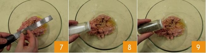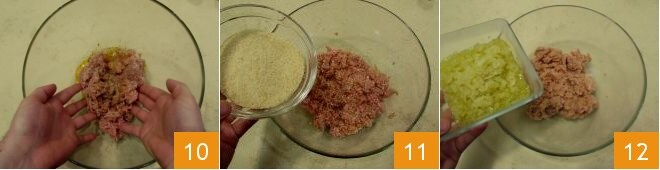 Mezcla bien todos los ingredientes trabajando la mezcla con las manos 10, luego añade el pan rallado 11 y sigue amasando. Añade también la cebolla pochada ya tibia 12,