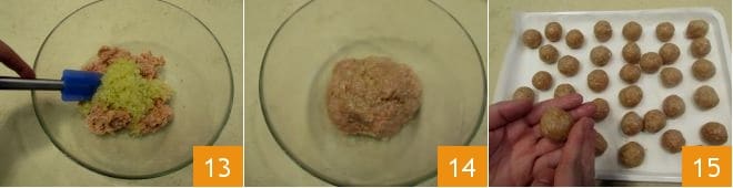 mezcla todo con la ayuda de una espátula 13 hasta obtener una mezcla homogénea que dejarás reposar durante 10 minutos 14. Pasado el tiempo necesario, forma bolitas de 20-25 gr cada una con la mezcla que has preparado, pasándolas entre las palmas de las manos para darles una forma redonda 15 y procede de este modo hasta finalizar la masa: con nuestras cantidades deberás obtener 38 albóndigas.