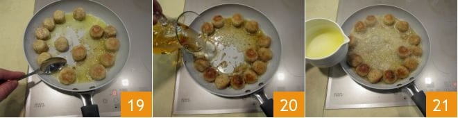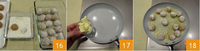 Pásalas por la harina 16, girándolas para que se adhiera de manera uniforme. Una vez terminado, derrite la mantequilla en una sartén grande 17 y cocina las albóndigas durante 2 minutos a fuego fuerte 18,