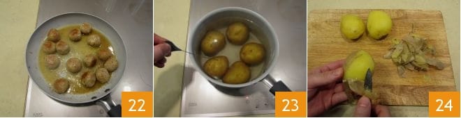 y cocina a fuego lento durante otros 3-4 minutos hasta que la salsa se haya espesado 22. Apaga, mantén las albóndigas calientes y mientras tanto prepara la guarnición de patatas. Lávalas bajo abundante agua fría corriente, luego hiérvelas con la piel durante 30 minutos 23. Posteriormente, pélalas 24