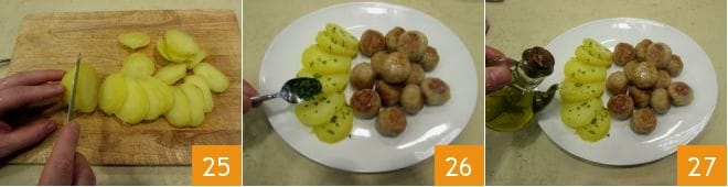 y córtalas en rodajas 25; sirve tus albóndigas danesas (Frikadeller) con patatas con perejil terminando con un poco de sal y una pizca de perejil 26 y con un hilo de aceite 27.