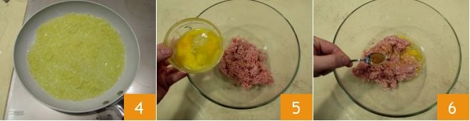 Apaga el fuego 4 y reserva en un bol para enfriar. Pon la carne picada en un bol, añade los huevos 5, la canela 6,