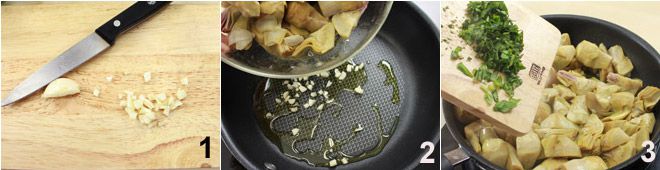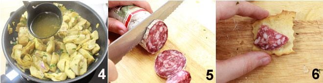 Para preparar los aperitivos a base de alcachofas salteadas y salami de Sant'Olcese, empieza limpiando las alcachofas y córtalas en gajos finos, y colócalos en un recipiente con agua y limón para evitar que se ennegrezcan. Prepara el caldo de verduras con el cual irás humedeciendo las alcachofas cada vez que se queden demasiado secas durante la cocción. Corta el ajo en trozos pequeños 1 y colócalos en una cacerola con el aceite, añade las alcachofas bien escurridas 2 y saltéalas un instante. Ahora, añade la albahaca picada 3, reservando algunas hojas para decorar al final.