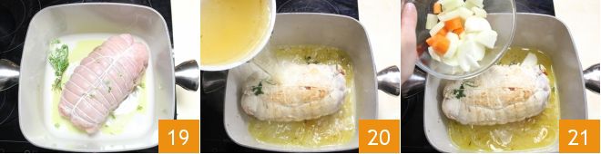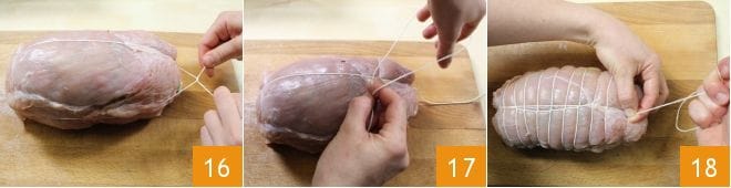 Ahora toma hilo de cocina y ata el asado que has formado: pasa el hilo primero por debajo y luego por encima de la carne, a lo largo, asegurando bien los extremos del hilo y dejando una parte del hilo un poco más larga 16. Utiliza el hilo más largo y procede regresando por el lado opuesto y luego forma un nudo en el extremo para crear la base para tu atado. Para formar la jaula, toma el hilo, crea un lazo sosteniendo la base del mismo con los dedos 17 e introduce la mano en el lazo y gira un par de veces la cuerda, luego pasa la carne a través del lazo obtenido. Asegura bien la base del anillo apretando el lazo creado alrededor de la carne y tirando ligeramente del hilo hacia arriba para apretar el nudo y repite esta operación a lo largo de toda la carne 18. Para realizar esta operación de la mejor manera, consulta nuestra Escuela de cocina: Cómo atar el asado.