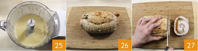 Tritura hasta obtener una mezcla homogénea 25 y si la salsa aún está líquida, transfiérela a una sartén y cocina a fuego lento, para que se espese. Ahora coloca el asado enfriado sobre una tabla de cortar 26 y córtalo en rodajas de aproximadamente 1/2 centímetro de grosor 27. ¡Solo te queda servir el asado frío de pavo tanto caliente como frío con la salsita de acompañamiento!