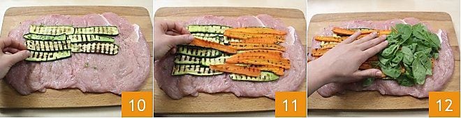 Luego calienta una parrilla y, una vez caliente, asa las rodajas delgadas de calabacín 7 y zanahoria 8 por ambos lados hasta que estén ligeramente asadas pero suaves. Luego pasa a la composición del asado: coloca la loncha de pavo sobre una tabla de cortar y aromatízala con sal, pimienta al gusto y hojas de tomillo 9.