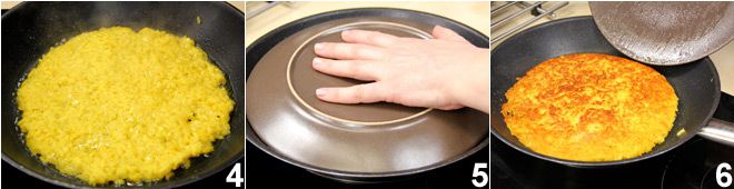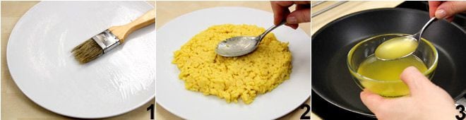 Para preparar el arroz a la sartén, primero untad un plato 1 y dividid el arroz en 4 partes iguales (si no sabéis cómo preparar el arroz amarillo, ved cómo hacerlo haciendo clic aquí), luego tomad una porción y aplastadla con el dorso de una cuchara 2 hasta formar un disco fino. Calentad una sartén con un diámetro de 24 cm y verted en el centro de ella una cucharada de mantequilla clarificada 3 (si no sabéis cómo prepararla, ved cómo obtenerla haciendo clic aquí); trasladad el disco de arroz a la sartén usando una espátula fina y larga con la que pasaréis por debajo del arroz separándolo del plato. Si durante esta operación el disco se rompe, no os preocupéis: recomponedlo en la misma sartén ayudándoos con el dorso de la cuchara.