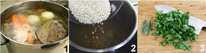 Para preparar el arroz y perejil, comienza con la preparación de un buen caldo de carne 1 (haz clic aquí para ver cómo proceder). Luego, llévalo a ebullición en una cacerola grande y añade el arroz 2. Cocina el arroz durante unos 15 minutos, mientras tanto limpia dos hojas de salvia y un manojo de perejil 3