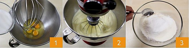 Mientras las galletas se enfrían, empezad a preparar la crema para rellenarlas: en un bol grande poned los huevos y el azúcar 10 y mezclad con una batidora manual 11 o una batidora eléctrica hasta obtener una crema clara y espumosa. Luego añadid la harina 12 y continuad mezclando bien los ingredientes.