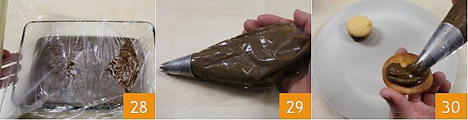 Cuando la crema de café esté lista, apagad el fuego y transferidla a un recipiente de vidrio. Cubridla con film transparente haciendo que se adhiera a la crema 28 y dejad enfriar todo por aproximadamente una hora en el frigorífico. Pasado el tiempo necesario, llenad una manga pastelera con boquilla de estrella con la crema de café ya fría 29 ayudándoos con una espátula o una cuchara. Luego tomad las galletas ya frías y empezad a rellenar la mitad con la crema de café 30.