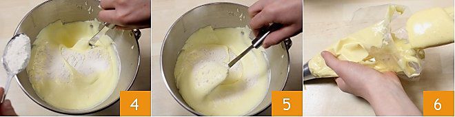 Luego quitad las varillas y añadid gradualmente la harina y la levadura a la crema 4, mezclando con una espátula para integrar todo. Tomad una manga pastelera con boquilla simple y verted dentro la crema ayudándoos con la espátula 6.