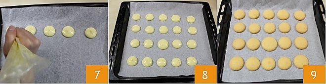 Forrad con un papel de horno una bandeja y empezad a distribuir la crema con la manga pastelera para crear discos de masa de unos 3 cm de diámetro 7, procurando espaciarlos unos centímetros 8. Hornead en horno estático precalentado a 190° durante al menos 12 minutos (si es ventilado a 170° por unos 6 minutos) o hasta que los disquitos se hayan inflado ligeramente y empiecen a dorarse apenas en los bordes. Luego sacad la bandeja del horno y dejad templar las galletas obtenidas 9.