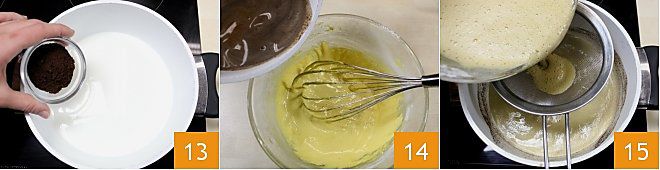 Reservad la crema obtenida; mientras tanto en una cacerola grande verted la leche. Encended el fuego bajo y dejad que se caliente añadiendo el café en polvo y mezclando para que se disuelva 13. Dejad que casi llegue a hervir, luego apagad el fuego 13. Luego verted la leche y café obtenidos en la crema que habíais reservado 14 y mezclad con la batidora para integrar todo. Luego transferid esta mezcla a la misma cacerola donde habíais calentado la leche, filtrándola con un colador 15. Mezclad y encended el fuego para espesar la crema. Luego apagad y reservad.