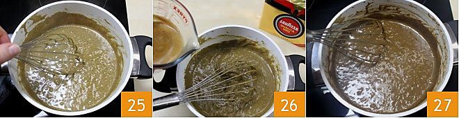 En este punto retomad la cacerola con la crema de café que habíais espesado a fuego bajo mezclando con la batidora 25 y añadid en hilo el café con la gelatina disuelta 26. Mezclad con la batidora y si la crema resultara demasiado líquida volved a poner la cacerola en el fuego bajo para espesar continuando a mezclar con la batidora 27.