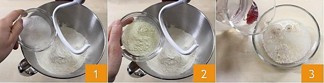Para preparar el bagel de Jerusalén, en el bol de una batidora con gancho, o en un bol grande si amasas a mano, mezcla la harina, el azúcar y la leche en polvo (1-2). Con una pequeña parte de agua tibia, disuelve la levadura en un cuenco pequeño 3 y
