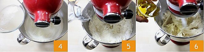añádela a las harinas 4. Disuelve la sal en el agua restante y añádela también a la masa, vertiéndola en hilo mientras amasas 5. Por último, añade el aceite 6 y deja amasar hasta que la masa esté bien ligada, se desprenda bien de las paredes y haya absorbido completamente todos los líquidos.