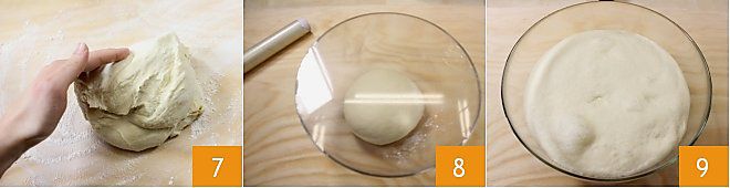 Pasa la masa a una superficie ligeramente enharinada 7, amásala un poco más con las manos, luego forma una bola y colócala en un bol, cubierto con film plástico 8. Deja que la masa leve en el horno apagado pero con la luz encendida durante unas 2 horas, hasta que haya duplicado su volumen 9.