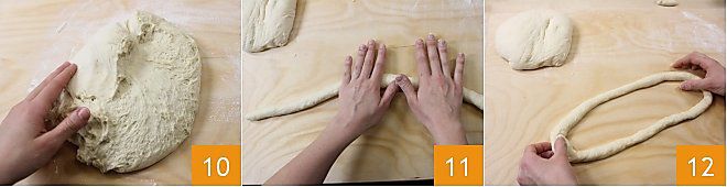 Una vez crecida, vuelca la masa del bagel sobre la superficie 10 y divídela en 5 porciones de aproximadamente 220 g cada una. Moldea cada porción en forma de cordón de unos 80 cm de largo y une los dos extremos, presionándolos ligeramente para cerrar el óvalo 12.