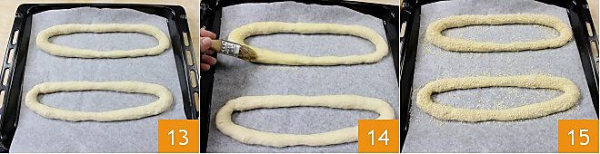 Coloca los bagels de Jerusalén obtenidos en una bandeja de horno cubierta con papel de hornear 13; úntalos con un huevo batido 14 y espolvorea la superficie con un puñado de semillas de sésamo y azúcar 15.