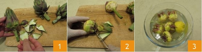 Para preparar una bandeja de pasta, alcachofas, patatas y guisantes, comienza limpiando las alcachofas. Quítales las hojas exteriores más duras 1 hasta llegar a las tiernas; corta las puntas de las hojas restantes 2 y excava en el centro de la alcachofa para eliminar el heno. Luego, colócalas en una mezcla de agua y limón muy fría para que no se oscurezcan 3.