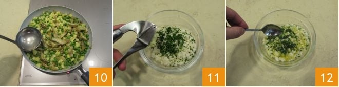 Mezcla suavemente y añade un cucharón de agua de cocción 10, cubre con la tapa y deja cocinar a fuego lento el tiempo necesario para que las patatas estén tiernas pero no se deshagan (bastarán unos pocos minutos). Apaga el fuego, sazona con sal y pimienta. Mientras tanto, desmenuza finamente la miga del pan duro y colócala en un bol junto con el perejil picado, el ajo machacado 11, la sal y el aceite 12.