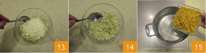 Añade también los quesos rallados 13 y mezcla bien los ingredientes 14. En este punto, cuece las penne en abundante agua salada, al gusto 15.