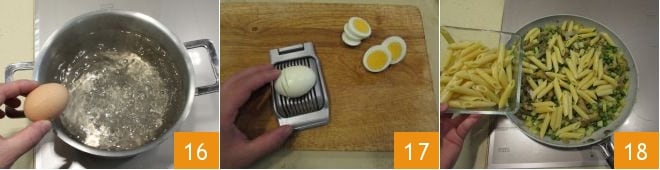Luego prepara los huevos duros 16, hasta que estén bien cocidos. Luego córtalos en rodajas con el utensilio adecuado o con un cuchillo 17 y resérvalos. Escurre la pasta, viértela en la cacerola y mézclala con el condimento recién preparado 18.