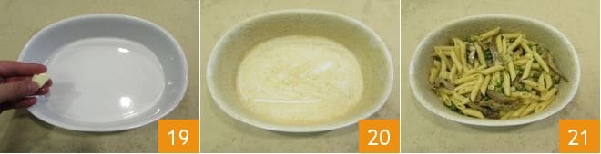 Toma una fuente para horno, úntala con mantequilla 19 y cúbrela con pan rallado 20. Luego llénala con la mitad de la pasta recién preparada 21.