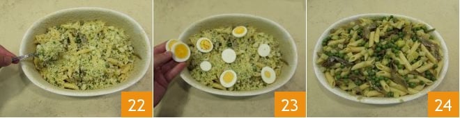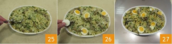 Cubre con el resto del pan rallado 25, añade las otras rodajas de huevo 26 y hornea en horno estático precalentado a 180° durante unos 20 minutos; luego sube el horno a 200° y continúa otros 10 minutos, hasta que en la superficie se forme una bonita costra dorada. O para acelerar esta operación activa el grill del horno durante 2-3 minutos (en este caso se desaconseja utilizar el horno ventilado ya que tendería a secar la pasta). ¡Sirve tu bandeja de pasta, patatas, alcachofas y guisantes todavía caliente 27!