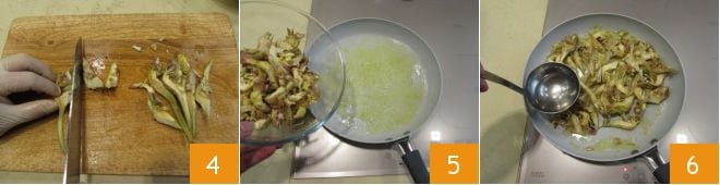 Corta las alcachofas en 4 y de cada cuarto saca 4 tiras 4. En una cacerola prepara un sofrito con la cebolla finamente picada y un chorrito de aceite; una vez que la cebolla esté pochada, añade también las alcachofas 5. Déjalas dorar durante unos 5 minutos, sazonándolas con sal y pimienta, y añade también un cucharón de agua de cocción de la pasta 6.