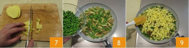 Mientras tanto, pela, lava y corta las patatas en cubos, de aproximadamente medio cm de grosor 7. Añade los guisantes desgranados a la cacerola con las alcachofas 8, deja que se mezclen los sabores y añade también los cubos de patata 9.