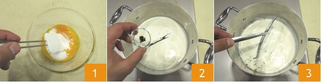 Para preparar el bavarois de chocolate blanco y salsa de menta, triturad el chocolate blanco y reservadlo. Luego en un bol, mezclad el azúcar y las yemas integrando bien con una espátula 1. En un cazo verted la leche junto con la nata. Abrid la vaina de vainilla a lo largo y extraed las semillas, raspándolas con un cuchillito. Poned a infusionar la vaina de vainilla y sus semillas 2 y llevad al fuego a baja llama. Cuando haya alcanzado el punto de ebullición, retirad la vaina de vainilla 3.