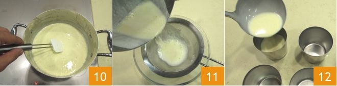 Continuad mezclando hasta que el chocolate esté completamente derretido 10, luego filtrad la crema pasándola por un colador de malla fina 11, y finalmente vertedla en moldes de 5 cm de diámetro y 7 de altura 12. Transferid los moldes al frigorífico para que se endurezcan por al menos una noche, mejor si es un día entero.