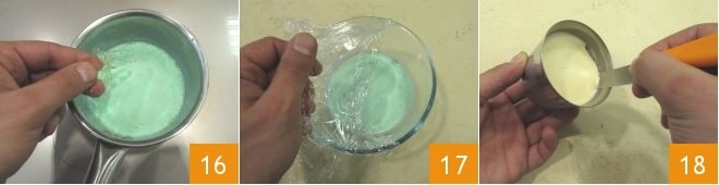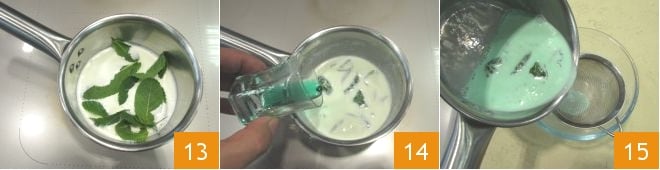 Pasad a ocuparos de la salsa de menta de acompañamiento. Calentad la nata con las hojas de menta 13. Una vez alcanzado el punto de ebullición, retirad del fuego y dejad en infusión durante una hora. Pasado este tiempo, añadid el jarabe de menta y el colorante si deseáis un color más intenso 14. Filtrad la salsa a través de un colador, para eliminar las hojas de menta 15.