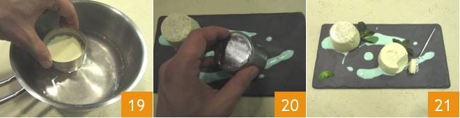 Para facilitar su extracción, sumergid por unos instantes el molde con el bavarois en agua caliente 19, teniendo cuidado de no alcanzar el borde para no mojar el interior. Voltead los moldes sobre el plato de servir 20 y servid los bavarois de chocolate blanco acompañados de la salsa de menta, adornando al gusto con unas hojitas de menta fresca 21.