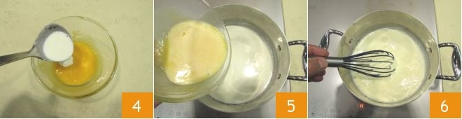 Templad las yemas azucaradas con un poco de la mezcla de leche caliente y vainilla 4, luego vertedlas en el cazo junto al resto de la leche 5. Integrad bien con la varilla 6 y dejad espesar hasta el momento en que, sumergiendo una cuchara en la crema, quede ligeramente velada. Una vez lista, retirad del fuego.
