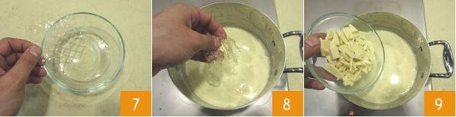 Poned la gelatina en hojas a remojo en agua fría durante 10 minutos 7, escurridla y añadidla a la crema caliente 8 continuando a mezclar. Finalmente, añadid el chocolate blanco triturado 9.