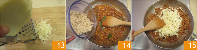 Ralle también el queso caciocavallo con un rallador de agujeros grandes 13. Vierta el pan triturado 14 y el queso en la sartén 15 y mezcle.