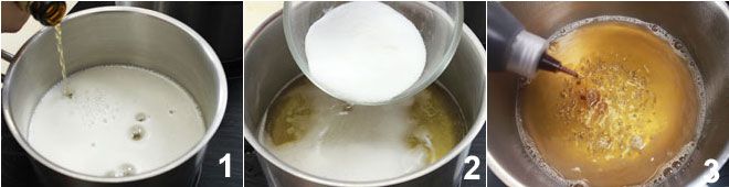 Para empezar, preparad la mezcla: poned al fuego un cazo con la cerveza 1 y añadid el azúcar 2. Cuando el azúcar esté completamente disuelto, añadid el café 3 y dejad el líquido al fuego hasta que el alcohol de la cerveza se evapore.