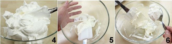 Mientras, montad la nata 4 y con una espátula ablandad el mascarpone 5. Incorporad la nata 6 poco a poco y con delicadeza al mascarpone y cuando estén perfectamente mezclados guardad en el frigorífico.
