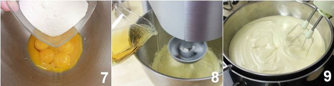 Ahora, proceded con la preparación del sabayón a la cerveza: montad, con la ayuda de un robot de cocina con varillas, las yemas con el azúcar 7 hasta que la mezcla quede clara y espumosa. Añadid en hilo la cerveza 8 a temperatura ambiente y continuad montando hasta su completa absorción. Verted vuestra crema en una cazuela con mango y colocadla al baño maría en otra cazuela más grande que la contenga, llena hasta 1/3 con agua caliente. Mientras tanto, continuad mezclando con una batidora eléctrica durante 10-15 minutos hasta que la crema esté espesa y esponjosa 9.