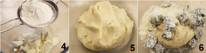 Ahora procede con la masa: coloca en un bol (o sobre una tabla) la harina tamizada, la mantequilla ablandada a temperatura ambiente 4, la levadura, la sal y la pimienta, luego amasa hasta obtener una pasta lisa 5. En este punto, añade el gorgonzola y el parmesano rallado 6 y amasa para mezclar bien los ingredientes,