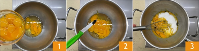 Para preparar el bizcocho con chantilly y frutos del bosque, trabajad huevos y yemas 1 con vainilla 2, sal y azúcar 3.