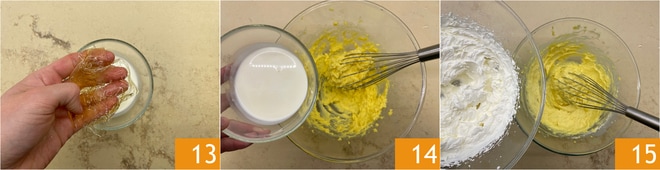 Poned la gelatina a remojar en agua fría durante unos 10 minutos, luego disolvedla en un poco de leche tibia 13 tomada de la cantidad necesaria para calentar para realizar 350 g de crema pastelera. Preparad la crema pastelera con el método clásico, luego dejadla enfriar. Añadid a la crema la leche tibia en la que habéis disuelto la gelatina 14, mezclad y dejad enfriar completamente. Añadid a la crema fría la nata montada 15.