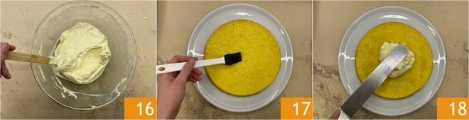 Mezclad los dos compuestos utilizando una espátula con movimientos de arriba hacia abajo 16. Ahora podéis componer el pastel: en un plato de servir poned un disco de bizcocho, humedeced con el almíbar preparado anteriormente 17, untad una capa de crema 18.